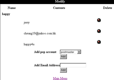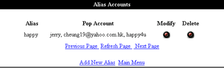 如要修改"別名"的設定,可於pic.8畫面中click "Modify" 按鈕進入pic.10 的畫面。在pic.10 中click "Delete"按鈕便能刪除該戶口與別名之間的聯系;另外,其它戶口皆想用這個別名,則可以填完"Add pop account"或"Add Email Address" 欄,並按下"Add"按鈕。